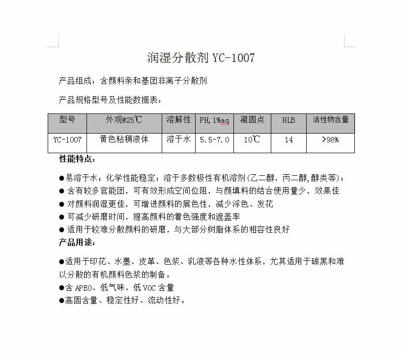 經(jīng)濟(jì)型水性有機(jī)顏料炭黑色漿分散劑YC-1007